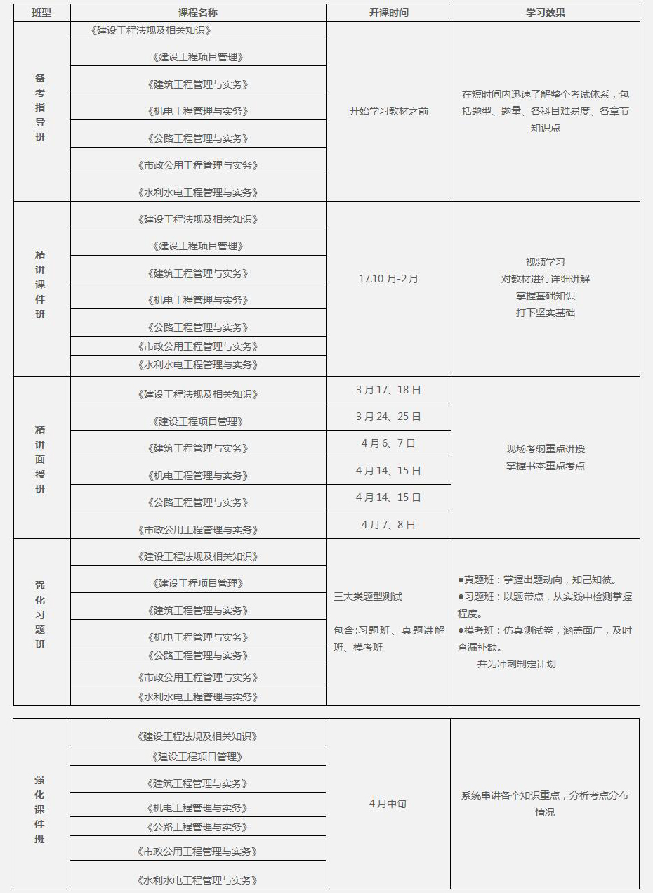 为确保2018年二级建造师学员轻松过关, 我校特聘全国最权威、最具实力师资团队首度联袂,包括前命题组成员、教材编委及改卷专家亲临面授,并为学员定制一套完整的复习计划。开办有精讲班、冲刺班、模考班、答题技巧班、密训班等多种类型班次,再配套网络课堂、教学课件等,培训内容直指2018年精准考点,保障学员学习效果,帮助学员一次性通过考试。